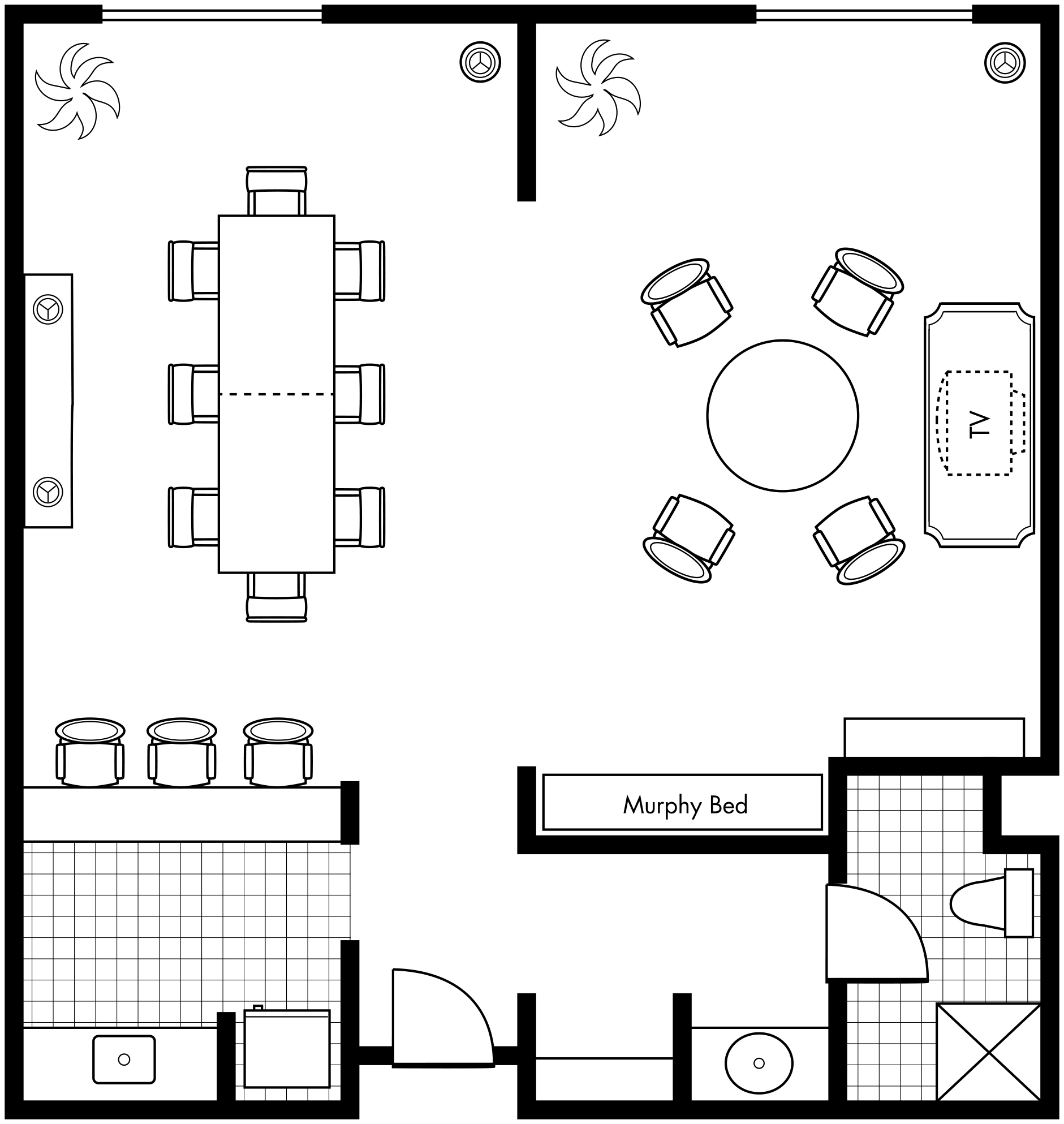 Impress clients and close deals in our spacious Hospitality Suite. An ample 600 square feet include a king-size murphy bed, boardroom table for eight and reception space to accommodate 30.