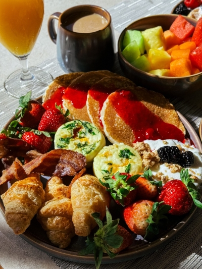 A plate full of pancakes, egg cups, croissants, and strawberries on a  table next to a mimosa, a cup of coffee, and a bowl of colorful fruit.