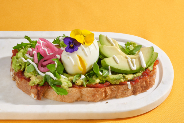 A colorful slice of toast on a round marble plate topped with avocado, greens, pink pickled onion, a hard boiled egg, and edible flowers.