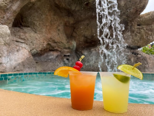 An orange and yellow cocktail garnished with citrus and cherries sits on the deck of a whirlpool with a cascading waterfall at Rosen Plaza, your destination for Father’s Day on International Drive.