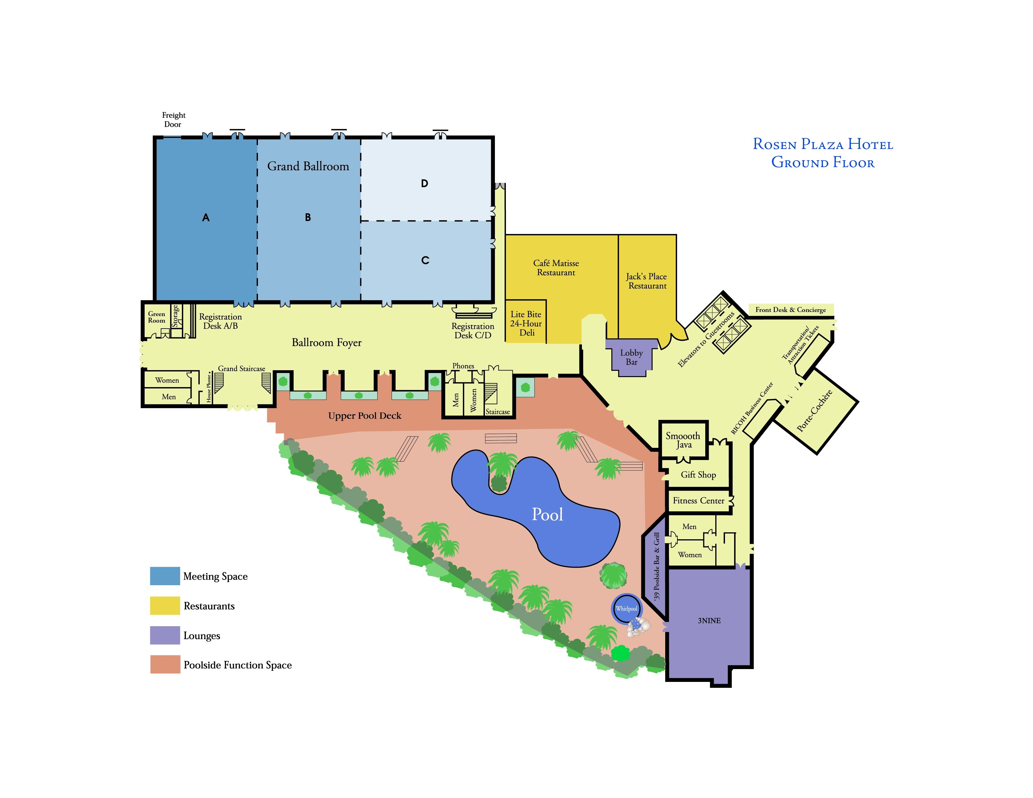 The hotel offers over 60,000 square feet of state-of-the-art, sophisticated meeting space, including the 26,000- square-foot Grand Ballroom and 22 distinctive meeting rooms. Advanced technical support, two permanent registration areas featuring lockable offices and separate storage, high-tech teleconferencing and simultaneous translation are also available at The Rosen Plaza Hotel.